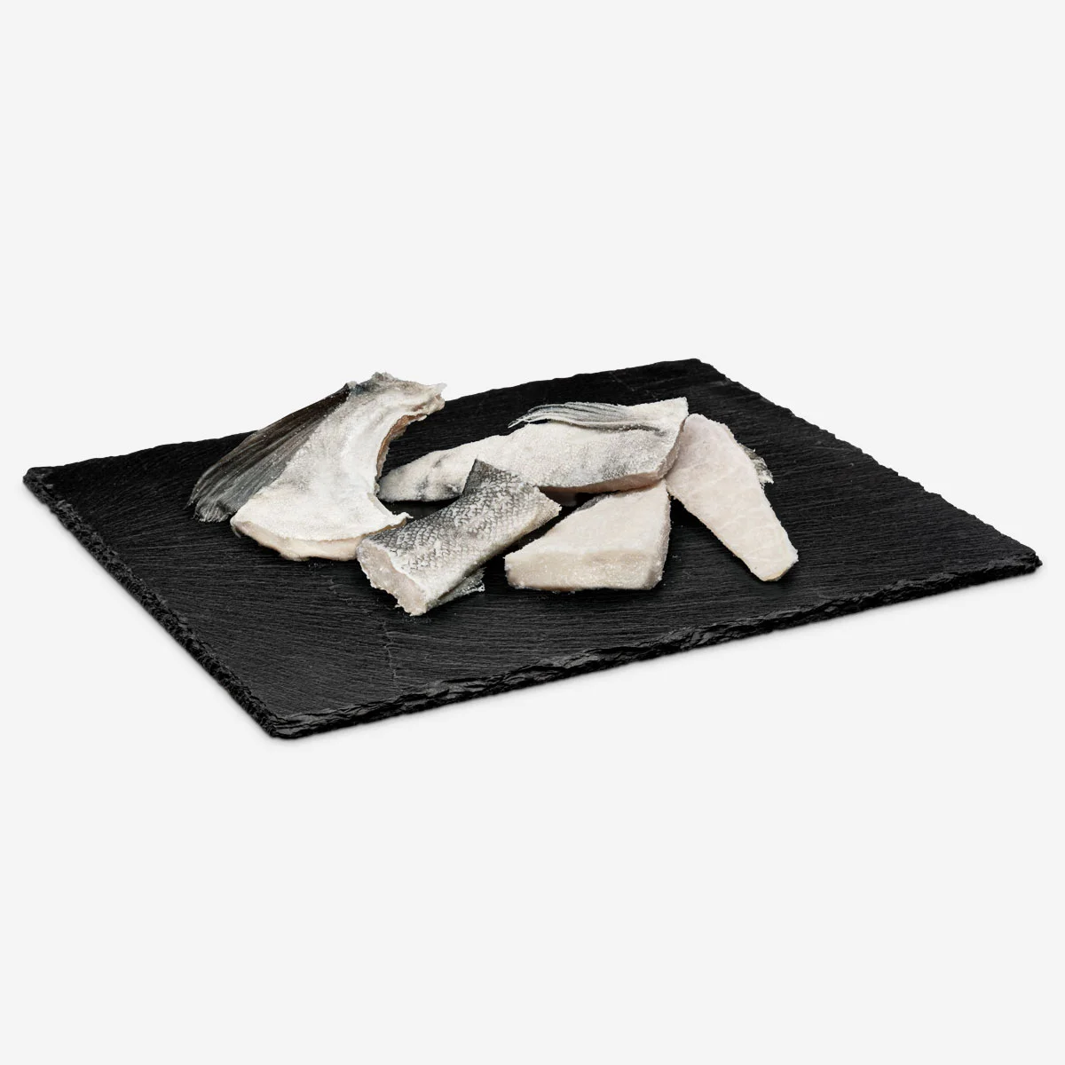 Pequeños trozos de bacalao desalado, listos para consumir. Ideal para escalibada con pimientos confitados y cebolla fresca. Recortes con espina. 5kg la caja.